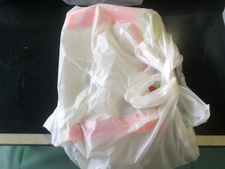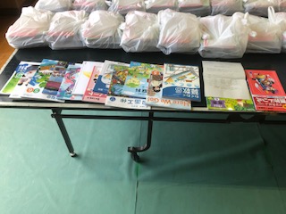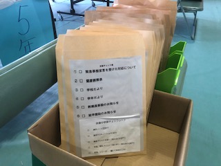 一人一人の教科書や教材をビニール袋に入れています。この中には写真のように教科書やドリル、学習で使うノート類が入っています。4年生、5年生、6年生については学習動画の公開に関する手紙も入っています。