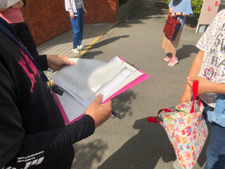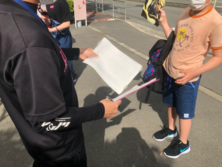 登校してきた児童には、まず、玄関で健康観察表の確認を行います。体温の記入がない場合には体温を測定します。