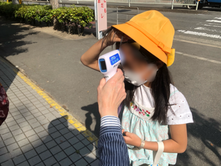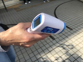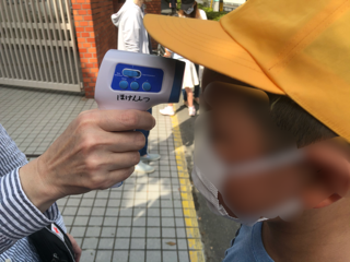 今日は2年生、3年生、4年生の登校日です。まず、玄関で健康観察表を見ます。体温の記入がない時は非接触型の体温計で体温を測定します。