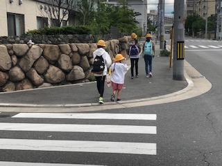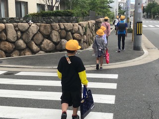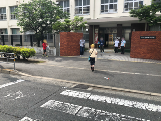 登校日の登校の様子です。校門で体温測定を確認して手をアルコールで消毒してから教室に入ります。