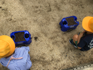 1年生があさがおの種まきをしました。まず、植木鉢に土を入れて肥料を混ぜました。
