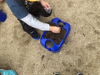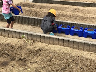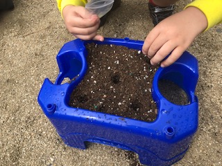 土に穴を開いてあさがおの種を入れました。学習園の周りに並べていきます。芽が出るのが楽しみです。