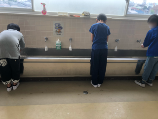 視力検査のあとには手洗いをしました。手の平に押した手洗いスタンプが消えるようにていねいに手を洗っています。