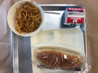1年生にとっては初めての給食です。今日の献立は、おかずがスパゲティミートソース、牛乳、パンです。パンは個包装となっています。