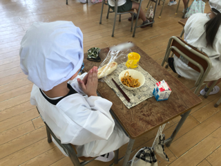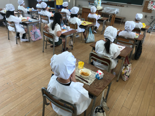 1年生と5年生は1組が二つの教室に分かれて給食を食べました。2、3、4、6年生は午前の部の子どもたちが給食を食べて下校した後に、午後の部の子どもたちが給食を食べるようになっています。