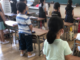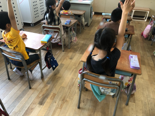 別の教室でも同じようにひらがなの学習を進めています。手を挙げて立って答えることも指導しています。