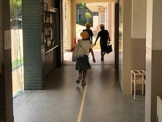 午後の部の子どもたちが登校してきました。6年生は多目的室、2・3・4年生は講堂へ行き、健康状態の確認などを行います。