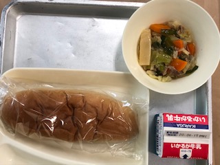 今日の給食は、大おかずが中華煮、黒糖パン、牛乳です。