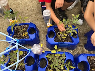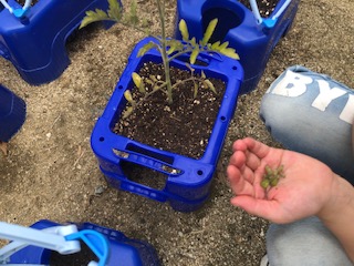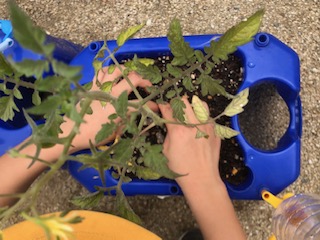 登校日に植えたミニトマトも生長してきました。今日はまず、わき芽をつみとりました。