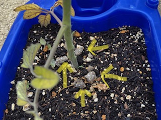 ミニトマトの土の上に肥料を置きました(矢印)。そのあと水やりをして支柱を立てました。大きくなって実がなるのが楽しみです。