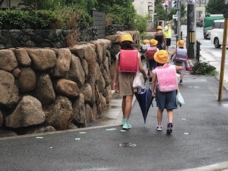分散登校・午前の部の子どもたちが登校する様子です。きょうだいや近所の友だちといっしょに登校している子どもたちが多かったようです。