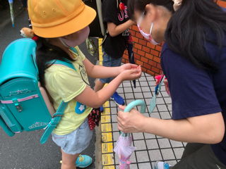 登校してきた子どもたちに教職員が体温の確認をして手指の消毒をしています。