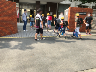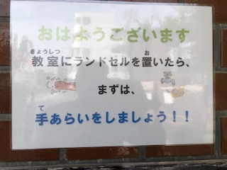 集団登校で子どもたちが登校してきました。学校では始めに手洗いをします。