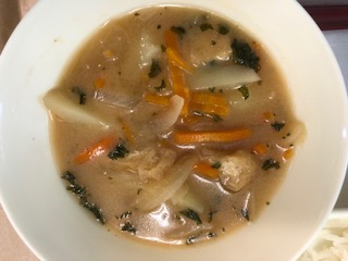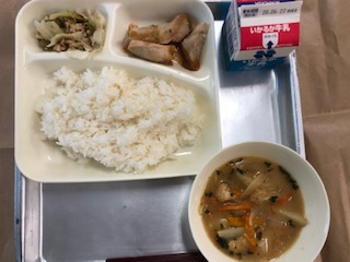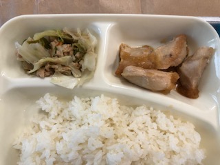 通常給食になって2日目の給食はごはんが出ました。おかずは鶏肉のおろしじょうゆかけ、みそ汁、野菜いための3品です。