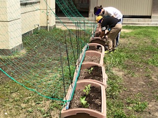 種をまいていたヒョウタンとヘチマが育ってきて大きなプランターに植え替えました。生長が楽しみです。