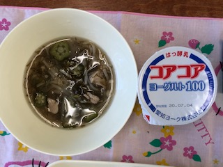 今日の給食は和風カレー丼、もずくとオクラのとろり汁です。ヨーグルトもつきました。