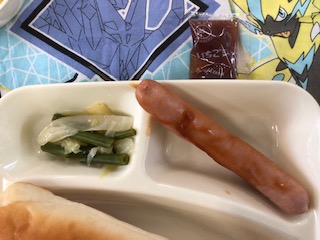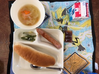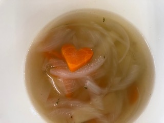 今日の給食はウインナーのケチャップソース、スープ、キャベツとさんど豆のサラダ、パンでいちごジャムがつきました。スープの中にはハート形のにんじんが入っているものもありました。