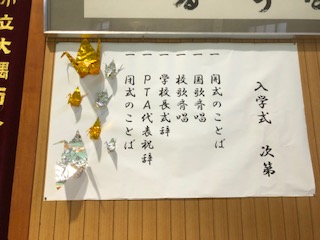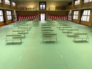 明日の入学式は10時から10時20分の間に保護者の方は1年生といっしょに学校までお越しください。保護者席はご家族1脚となっています。