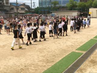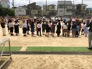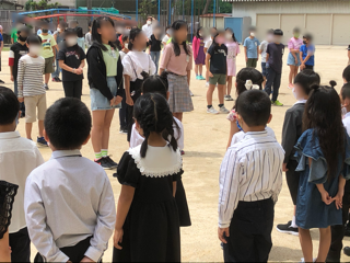 2年生から6年生が運動場に並び、その前に1年生が並んで向き合って対面式を行いました。代表の児童がお祝いと歓迎の言葉を1年生に伝えました。