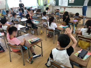 写真では黒板に4の目が示されていますのでさいころをふって3の目が出たら当たりです。3の目が出た子どもたちは大喜びでした。