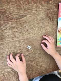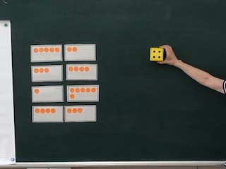 さいころを使って7になる数を考えていきます。担任がさいころの目を示します。子どもたちは自分のさいころをふって合わせて7になったら当たりです。