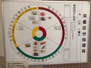 給食室の横には栄養区分指導板があり、健康給食委員会の子どもたちも書いています。