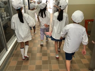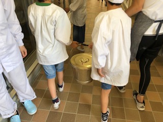 給食室で給食当番がおかずの食缶や牛乳などを給食調理員さんから受け取ります。