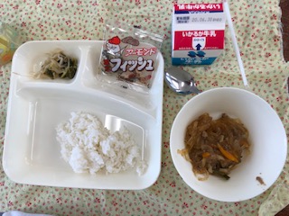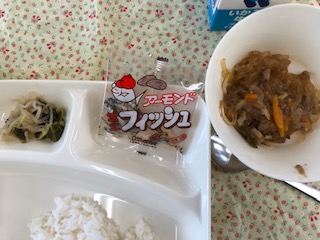 今日の給食は、マーボーはるさめ、チンゲンサイともやしの甘酢あえ、ごはん、牛乳です。アーモンドフィッシュもつきました。