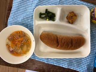 今日の給食は、鶏肉のカレーマヨネーズ焼き、てぼ豆のスープ、さんどまめとコーンのサラダ、ライ麦パン、牛乳です。