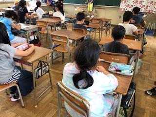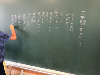 1年間の活動内容を黒板に書いています。この後、体育館で活動しました。