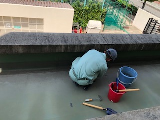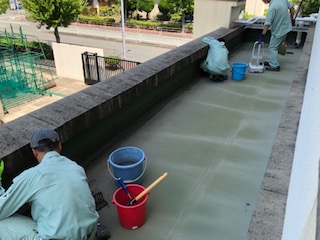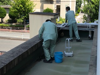 管理作業員が校内美化を行っています。ひさしの部分を清掃しました。