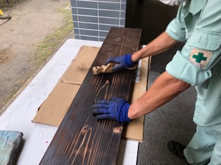 木の板の表面を焼いて加工しています。学習園の看板に使う計画です。