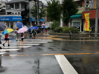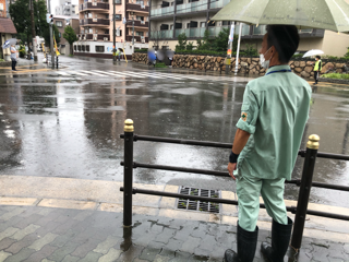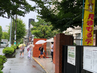 雨の中、老人会や地域の方、PTA 役員、教職員が通学路に立ったり、巡回したりして子どもたちの登校を見守りました。
