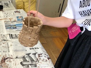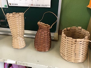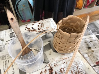 ていねいに作った作品にニスを塗っていきます。子どもたちの思いがこもった作品が並べられています。(写真は7月7日の授業の様子です)