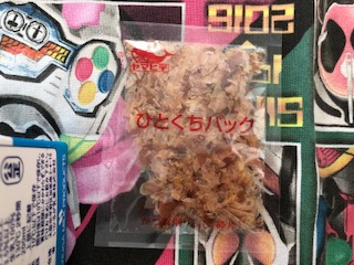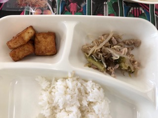 今日の給食は、ゴーヤチャンプルー、すまし汁、あつあげのしょうがじょうゆかけとごはんです。袋入りのかつおぶしがつきました。