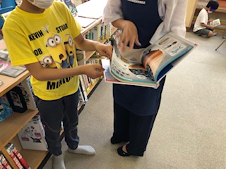 子どもたちが学校図書館で本を静かに読んでいます。学校図書館補助員の方にどんな本を選んだらよいかを相談している児童もいました。