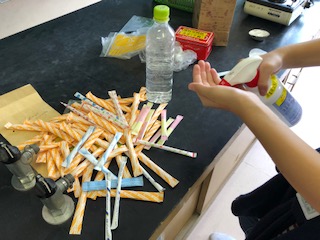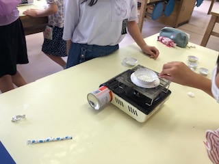 創作クラブでは砂糖を熱してべっこうあめを作りました。手の消毒も行っています。