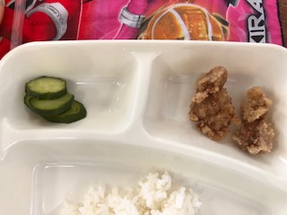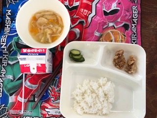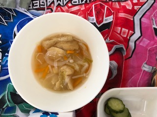 今日の給食は、すまし汁、豚肉の香味あげ、あっさりきゅうり、ごはんです。