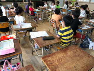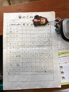 ごみについて学習しています。ごみについて家で調べてきたことを班で話し合っています。机の間隔を開けて行っています。