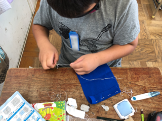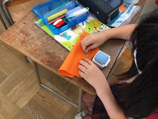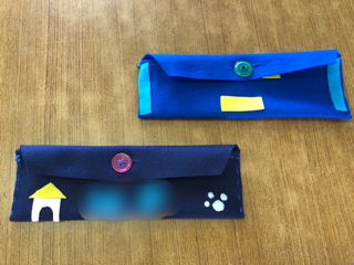 針や糸の使い方を学習して今度は小物作りに取り組みます。すでに仕上がっている作品もあります。(作品のイニシャルは画像を加工しています)