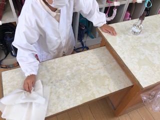 まず、配膳台をアルコール消毒します。