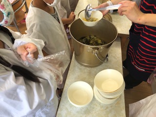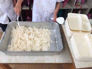 給食当番が運んできた食器やおかず、ご飯を盛りつけていきます。(写真は1年生です)