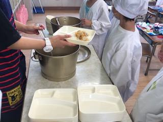 給食当番が一人一人の机の上に盛りつけた食器を配っていきます。
