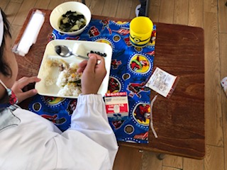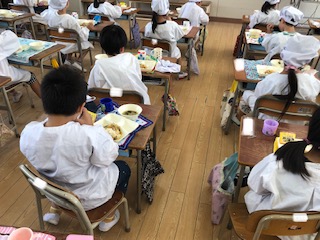 配膳も終わりました。いただきますのあいさつをして給食を食べます。机はまだ離したままで、前を向いて食べています。