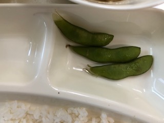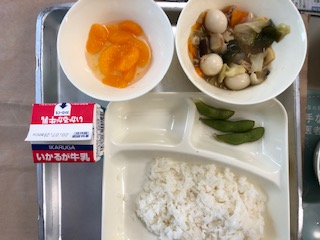 今日の給食は、八宝菜、ごはん、枝豆です。みかん(缶)がつきました。