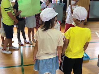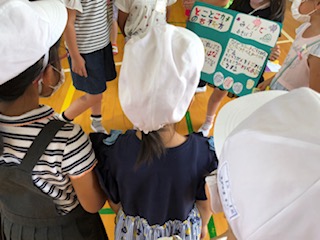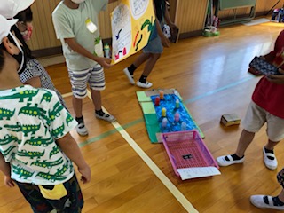 おもちゃごとのコーナーでは、2年生がていねいにルールを説明しています。1年生はしっかりと聞いています。