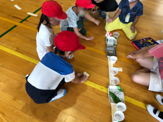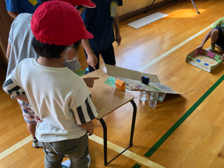 楽しくなかよく1年生と2年生がそれぞれのおもちゃコーナーで遊んでいます。2年生がうまくリードしていました。