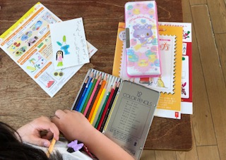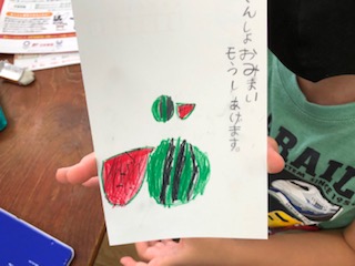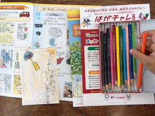 1年生が習い終えたひらがなを使って残暑見舞いのはがきを書いています。
