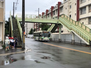 南門から出て、交番、幼稚園、中学校を見ながら歩きます。大学の側の歩道を歩いていきます。