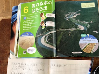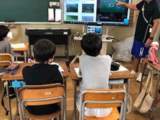 「流れる川のはたらき」で、三日月湖がどのようにできたのかを考えました。画面を見ながらいろいろな考えを発表していました。